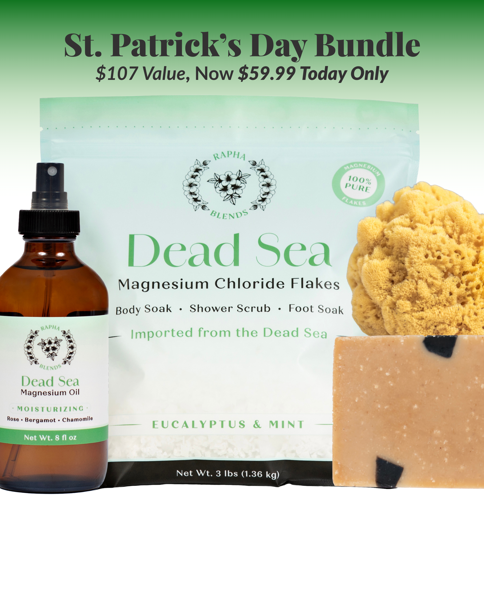 Our limited-time, *TODAY ONLY* St. Patty's Day Bundle brings together four of our most loved essentials in one simple routine: a mineral-rich soak; a deeply nourishing balm; a convenient targeted magnesium spray; and a natural durable sea sponge.